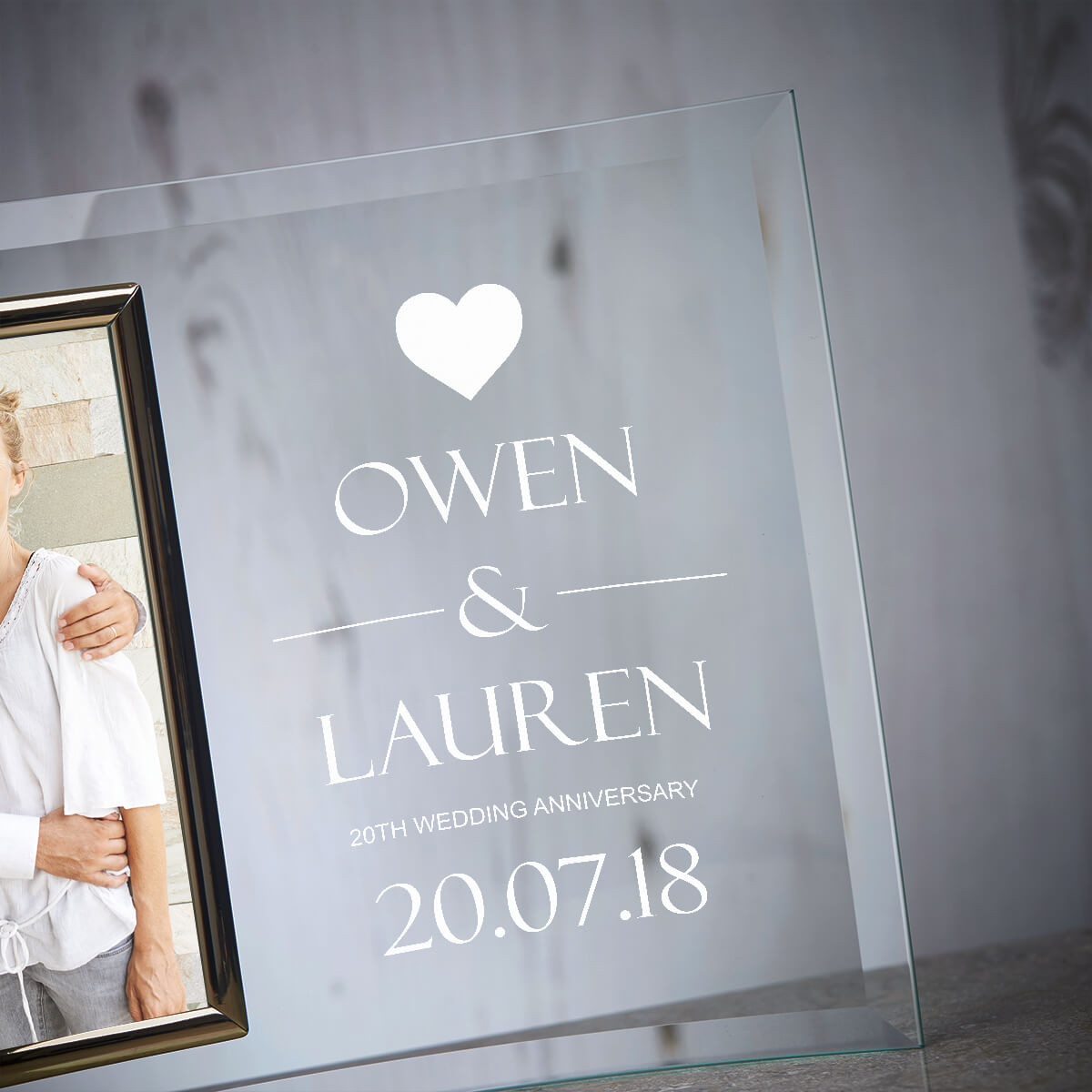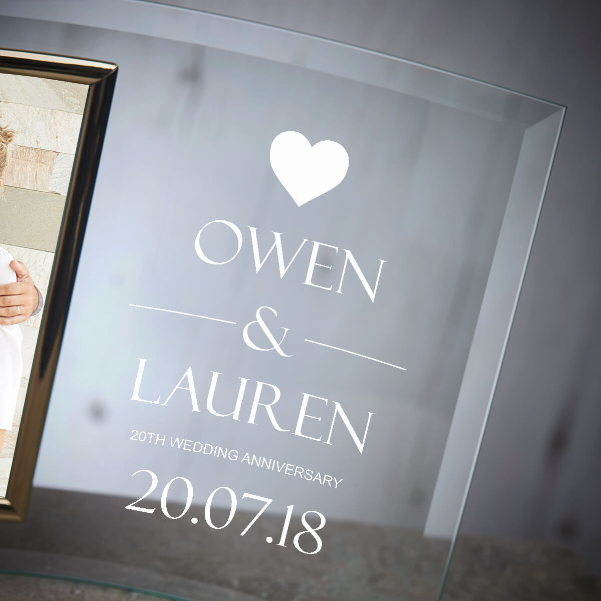 This curved jade glass picture frame is an ideal way to capture a special moment in time. The frame holds a standard 6x4" photograph and is supplied in a white presentation carton. It has a width of 252mm and height of 202mm. Add the names of the couple and the special date to this gorgeous 20th anniversary design.