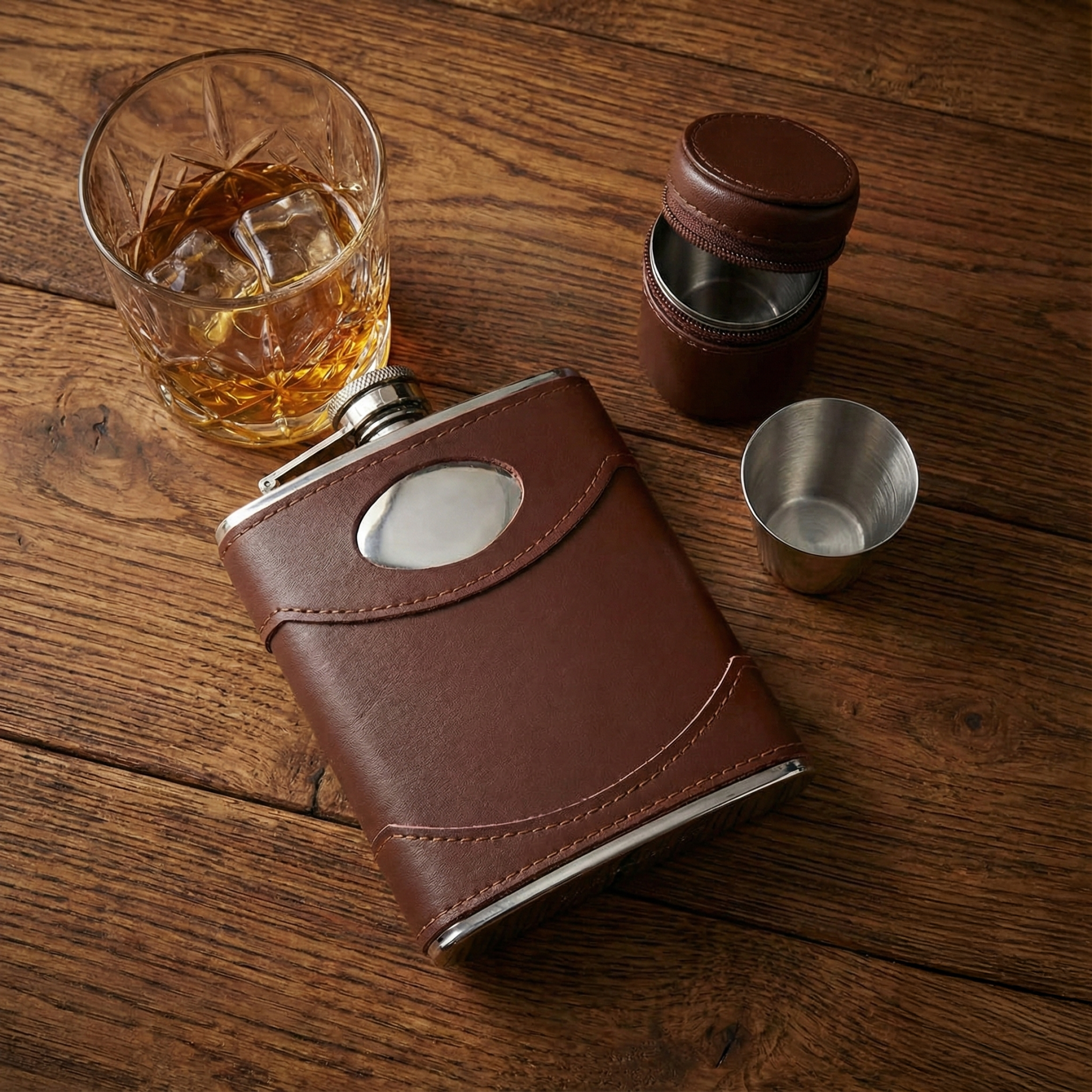 If you are looking for a stylish gift then look no further. This 6oz metal flask is covered with high quality brown leather finished with intricate stitching and a metal plate which can be engraved over 2 lines. This set also comes with 4 stainless steel cups in a matching storage case with a zip.
