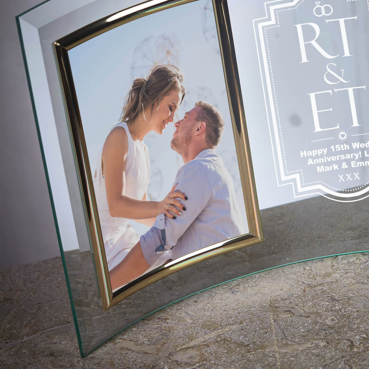 This curved jade glass picture frame is an ideal way to capture a special moment in time. The frame holds a standard 6x4" photograph and is supplied in a white presentation carton. It has a width of 252mm and height of 202mm. Add the initials of the couple and a message to this gorgeous anniversary design.