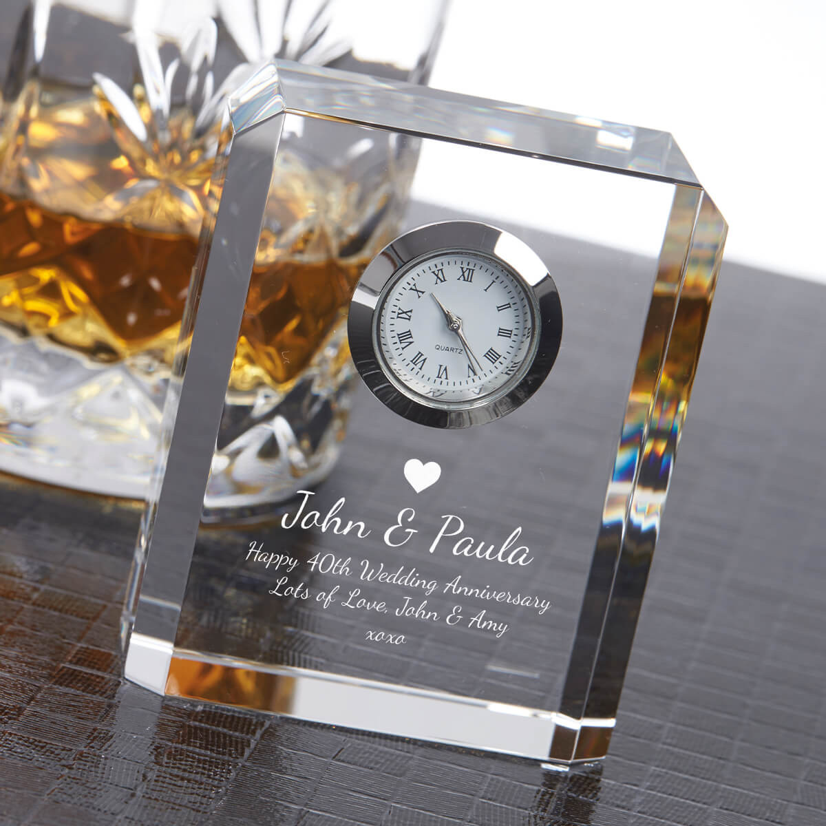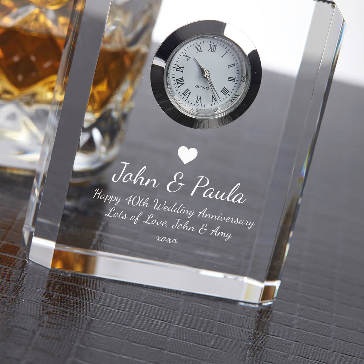A simple yet elegant practical gift perfect for any occasion. This 8cm clock has been crafted out of perfectly clear optical crystal and features large bevels down each side and the corner giving it a distinctive shape. This clock can be engraved with a message of your choice underneath a small heart icon. You have plenty of space available to add your message with 4 lines of text, line 1 being a large font size than the rest for any names. This makes a great gift for a special anniversary; it can sit proudly at home on a mantle or bedside and would look equally as good in the office.