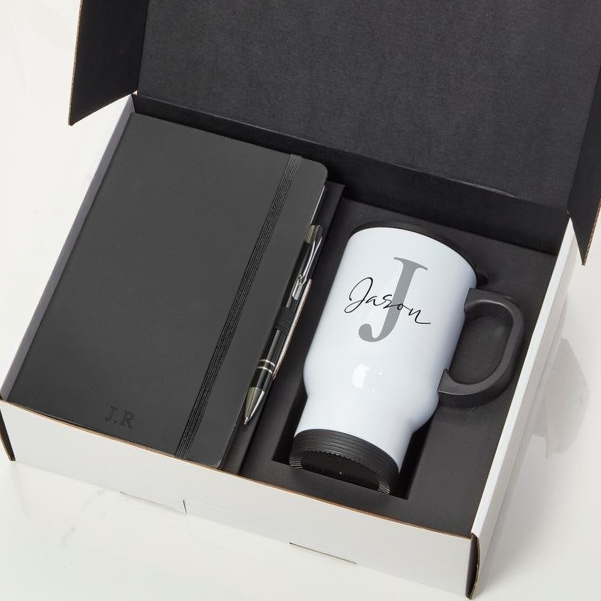 Finishing off the gift set is a white travel mug, with our most popular designs, featuring a name and initial in a stylish font. Our travel mugs are dye-sublimated and can last for years without fading.