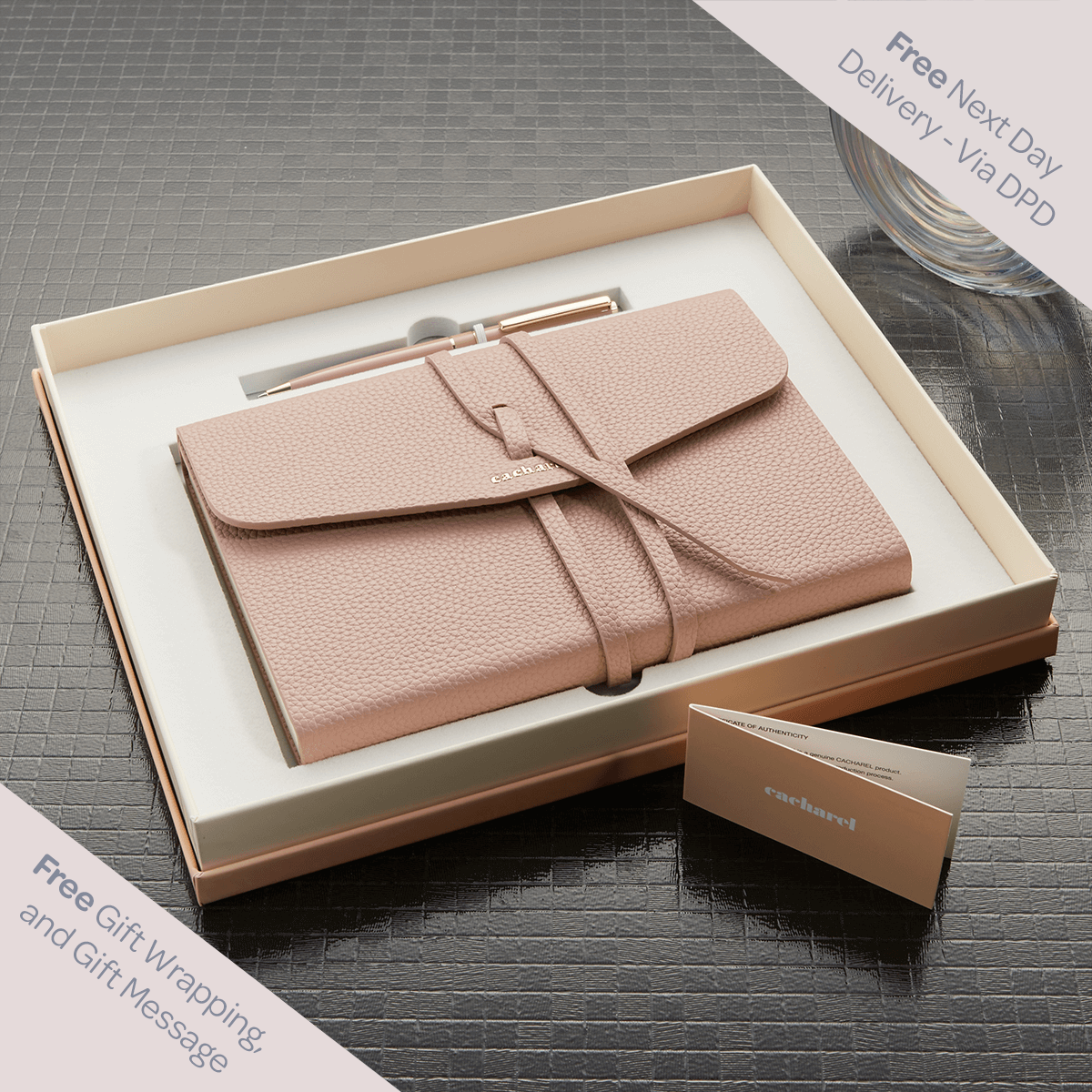 Elevate your everyday tasks with the Violette A5 Notebook Set in Nude by Cacharel; a perfect blend of elegance, practicality, and refined design. This stylish duo features a beautifully grained vegan leather (PU) notebook in a soft nude tone, paired with a sleek brass pen adorned with the iconic golden Cacharel logo.