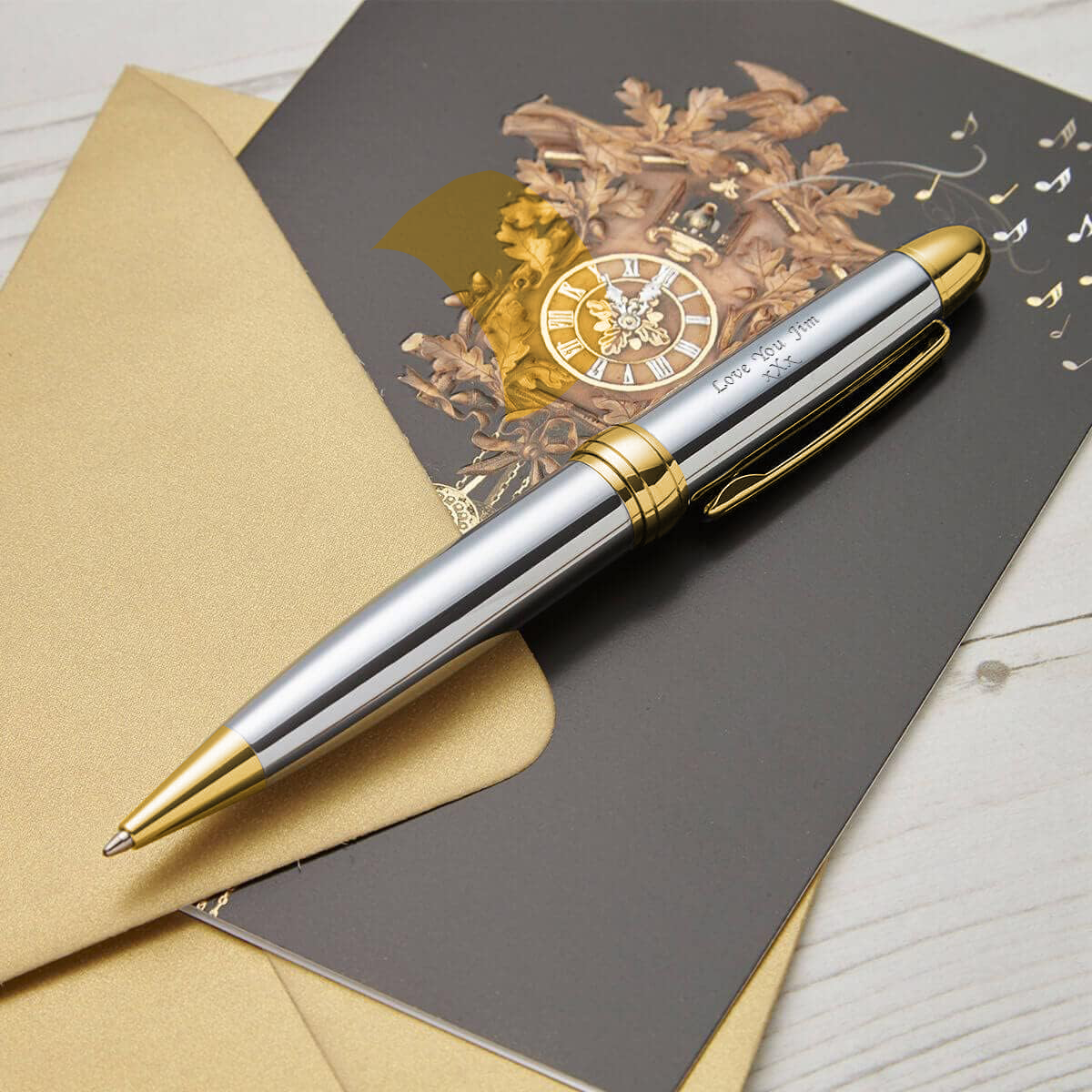 Do you have a certain friend or loved one who can never find a pen? Yes? Then look no further! The gold trim chrome pen case and rollerball is a classy personalised gift, highly versatile and suitable for a number of occasions including birthdays and Christmas. This product features plenty of room to leave the perfect message - up to four lines on the case (maximum of 35 characters per line), and one line on the pen itself (maximum of 18 characters per line).