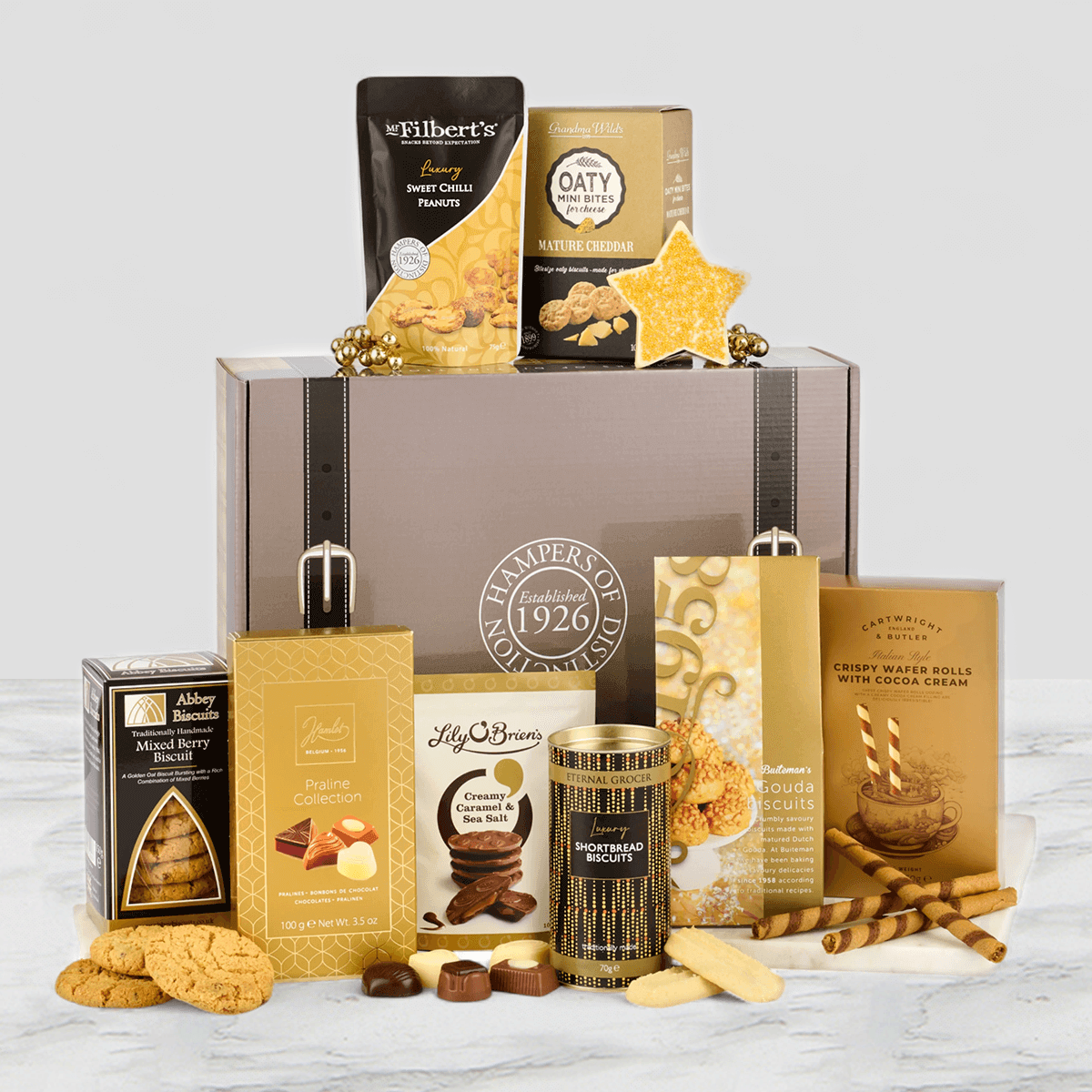 For those who prefer something sweet, indulge in Lily O’Brien’s Creamy Caramel & Sea Salt Chocolates, the playful Thornton & France White Chocolate Star with Sprinkles, and the decadent Hamlet Praline Collection. To complete the feast, savour Eternal Grocer Shortbread Biscuits, Abbey Biscuits Mixed Berry Biscuits, and the light, crispy layers of Cartwright & Butler’s Cocoa Cream Wafer Rolls.
