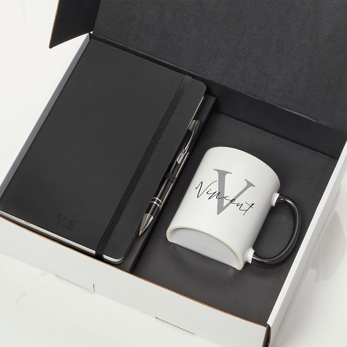 Finishing off the gift set is our inner colour black mug, with our most popular mug designs, featuring a name and initial in a stylish font. All our mugs are dye-sublimated are dishwasher safe and can last for years without fading.