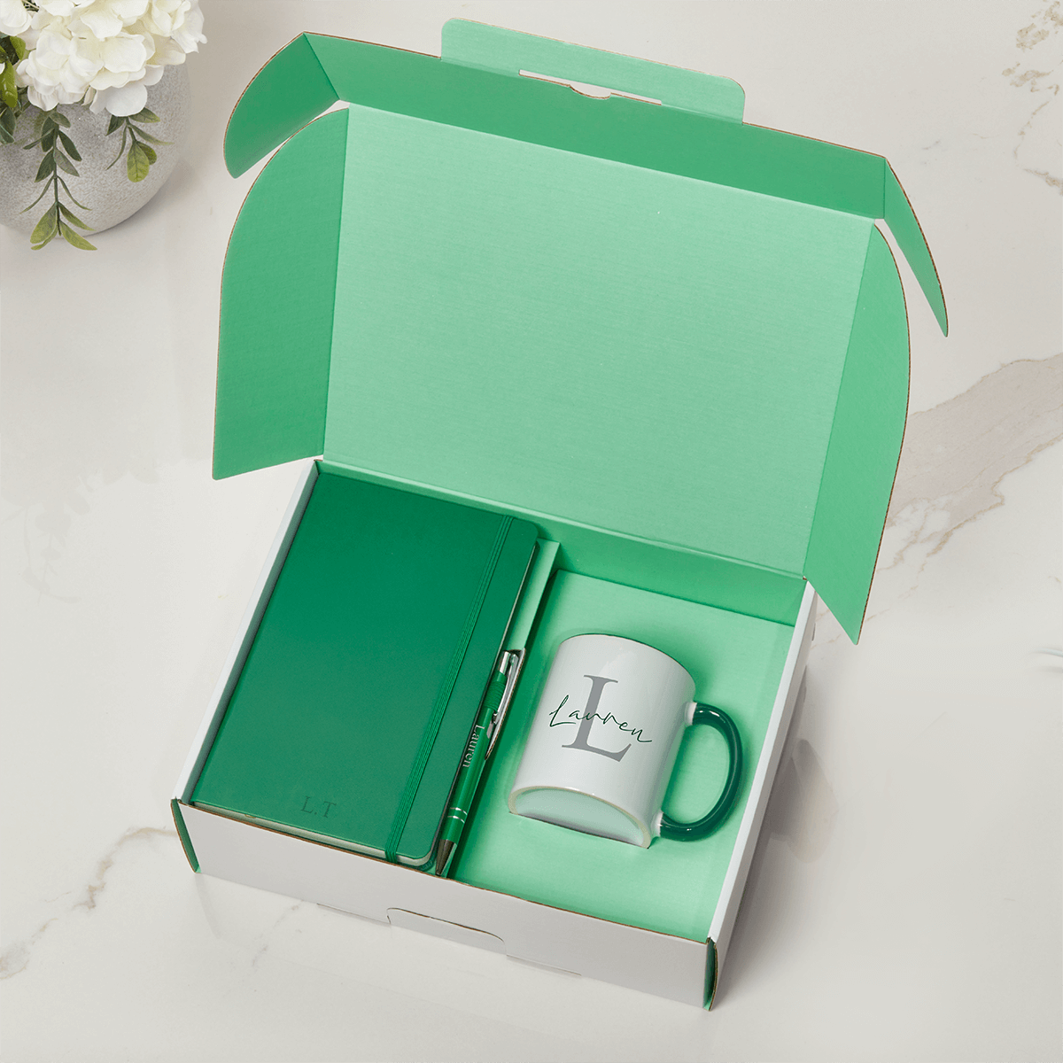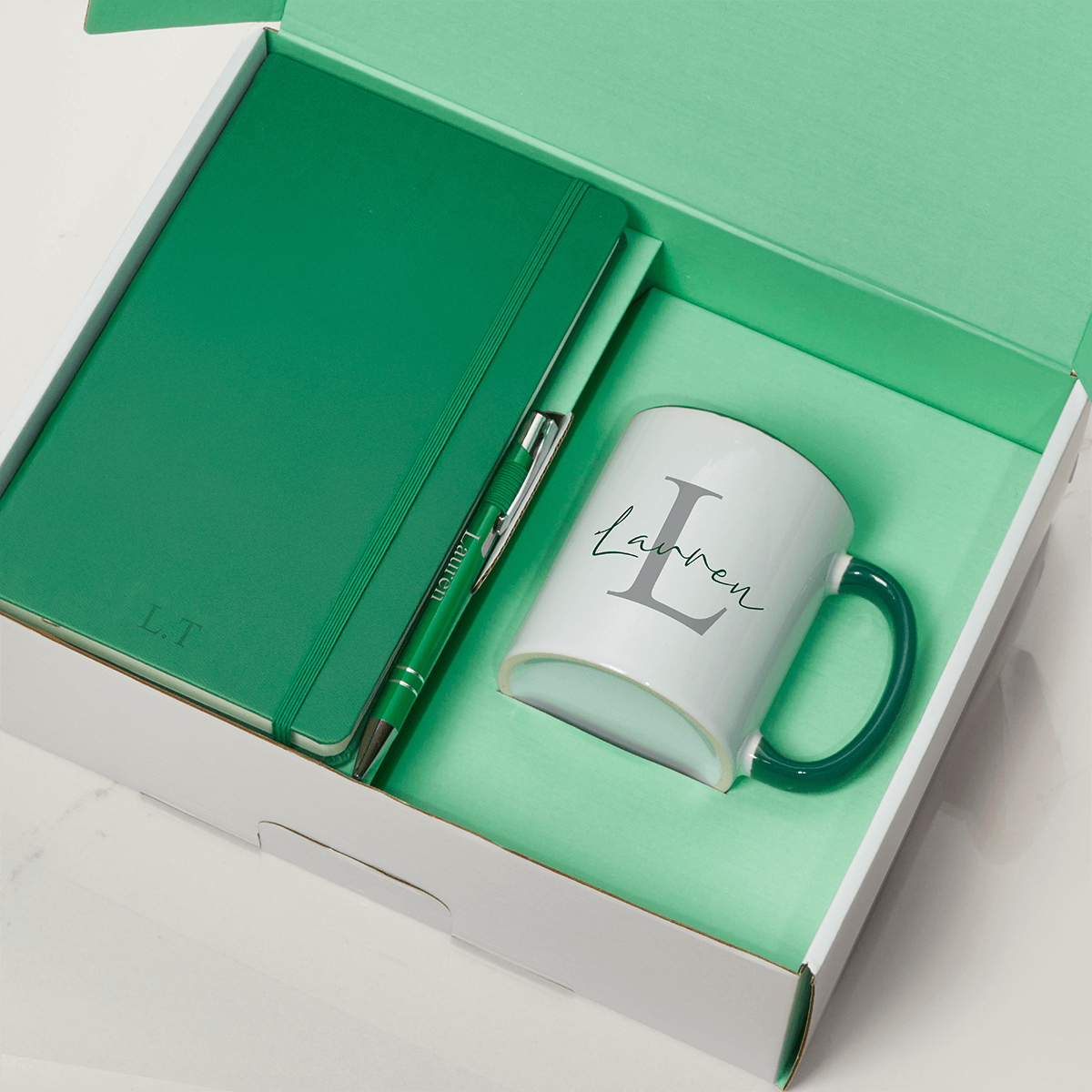 Finishing off the gift set is our inner colour green mug, with our most popular mug designs, featuring a name and initial in a stylish font. All our mugs are dye-sublimated are dishwasher safe, and can last for years without fading.