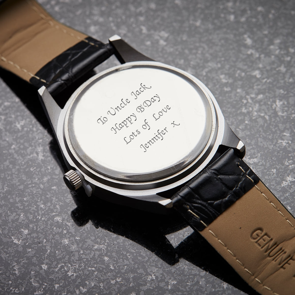 This sports-style analogue watch has a high shine case and a black clock face which creates the perfect base for the stunning dashboard style fixings. Featuring a modern 24 hour number set and contrasting red accents, this really is a fantastic choice for the man in your life. Ideal for Birthdays, Christmas or why not show your Dad just how amazing he is and give this for Father’s Day, he will be over the moon! We have also provided a luxury matt black gift box at no extra cost, your watch will be fastened around a plump ivory cushion and positioned perfectly for when the gift is presented. Our personalised jewellery and engraved jewellery is created specifically for personalisation and has been fashioned with the finest quality materials, your chosen piece will be diamond engraved by our highly skilled production team.