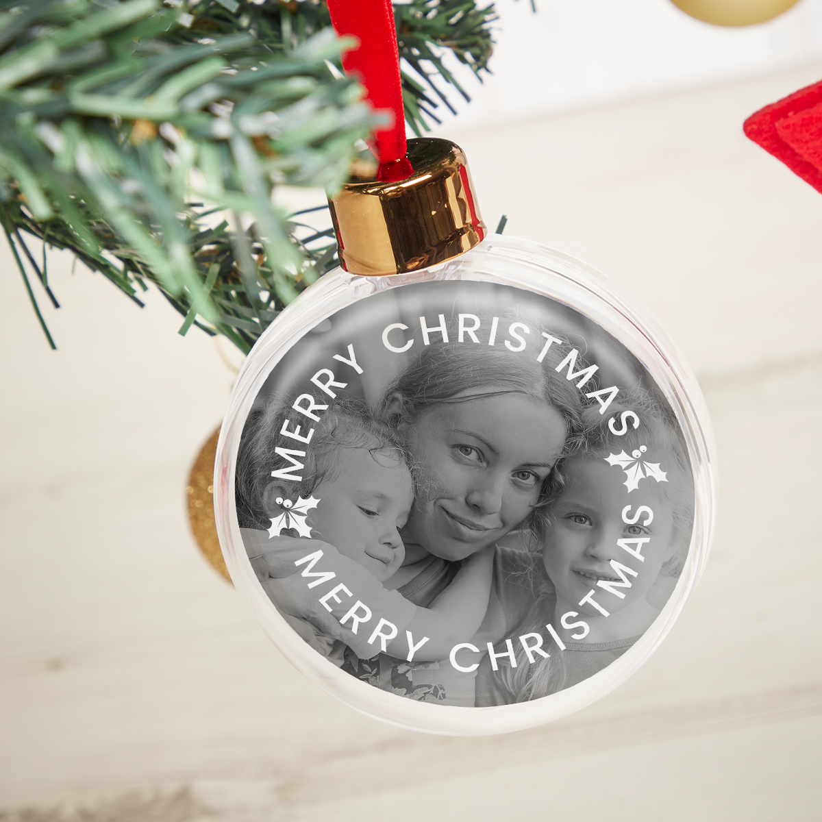 Create a truly unique Christmas tree decoration with our personalised photo bauble with our Merry Christmas design. Simply upload one of your favourite photos to feature in this charming spherical design. Measuring 8cm, the bauble boasts a clear front and a white back, making it a delightful addition to any festive tree. Finished with a gold cap and a luxurious red velvet ribbon for hanging, it's the perfect way to add a personal touch to your Christmas décor.
