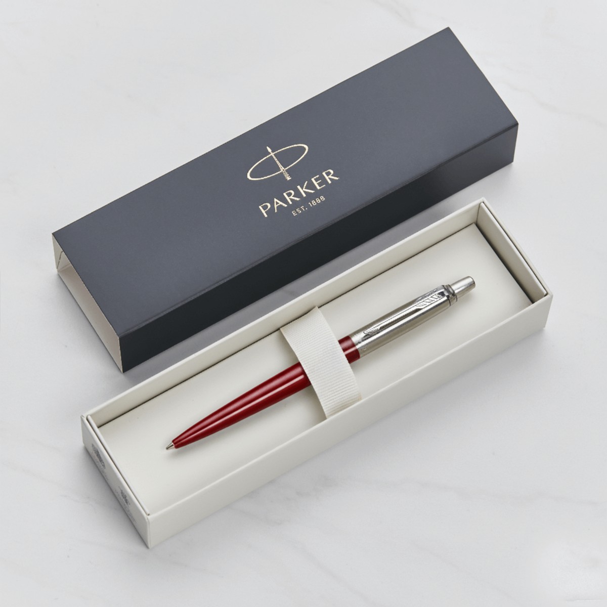 The Kensington Red Parker Jotter Ballpoint Pen showcases the timeless Parker design that has been trusted for over 60 years. This elegant pen includes a patented QuinkFlow ballpoint refill for a smooth and consistent writing experience, and arrives beautifully presented in a stylish Parker gift box.